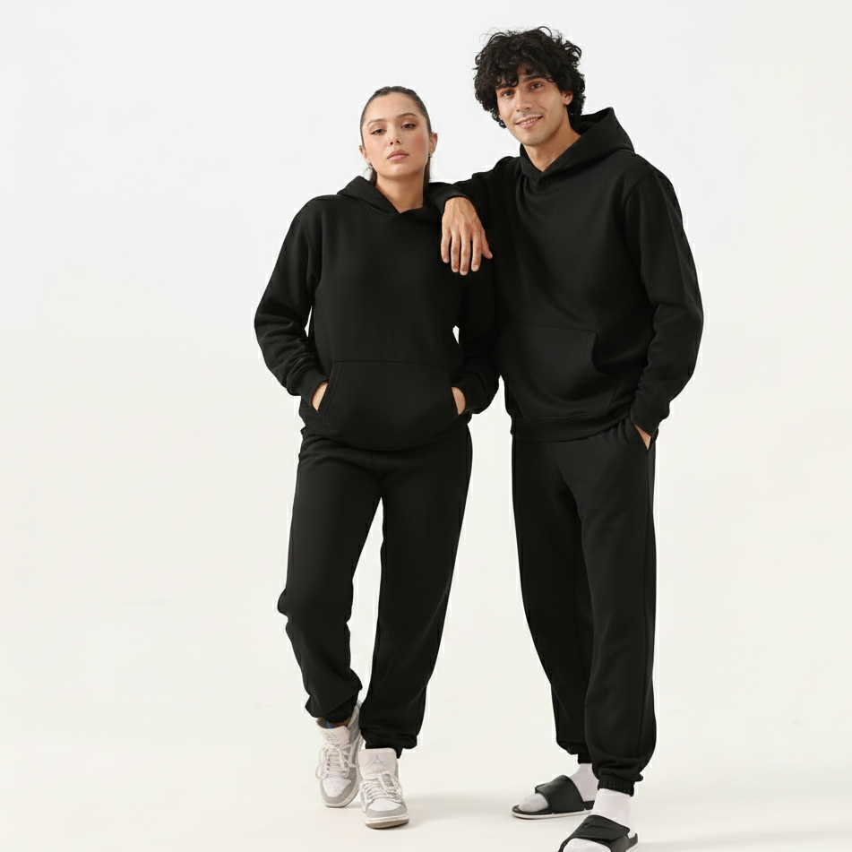 Introducing the Black Unisexco ord Set, featuring a Relax Fit Fleece hoodie and Matching Cuffed Relax Fit Trousers. Made with 80% cotton, 10% BCI cotton, and 10% polyester in 300gsm fleece, this set offers the perfect blend of comfort and style. Our male model is wearing a medium size and our female model is wearing a small size. Experience all-day comfort with a trendy twist, Elevate your loungewear game effortlessly with this must-have set.