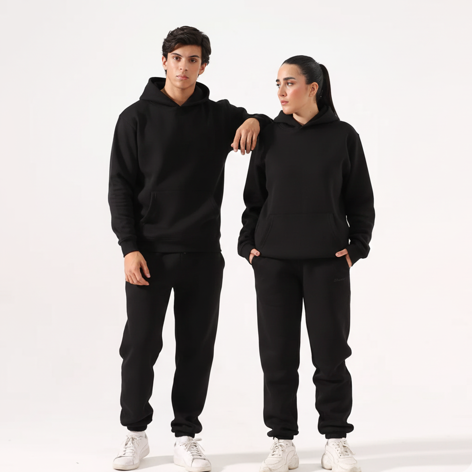 Introducing the Black Unisexco ord Set, featuring a Relax Fit Fleece hoodie and Matching Cuffed Relax Fit Trousers. Made with 80% cotton, 10% BCI cotton, and 10% polyester in 300gsm fleece, this set offers the perfect blend of comfort and style. Our male model is wearing a medium size and our female model is wearing a small size. Experience all-day comfort with a trendy twist, Elevate your loungewear game effortlessly with this must-have set.